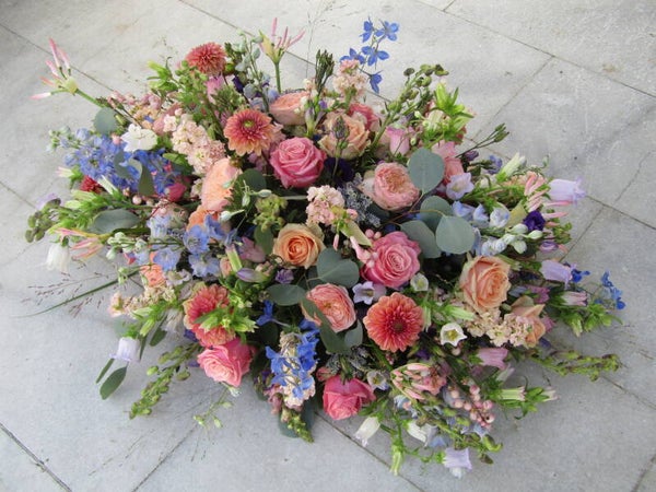 Deze kistbedekking is samengesteld uit een mix van zomerse bloemen in zachte pasteltinten. De bloemen zijn luchtig geschikt in een ovale vorm. Een prachtige aankleding voor op de kist.