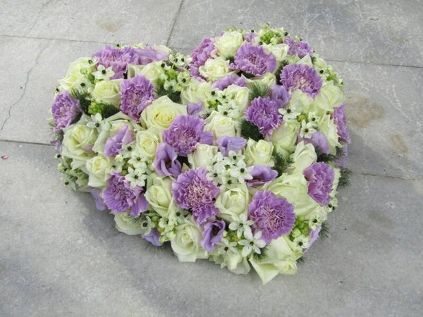 Dit rouwstuk in de vorm van een hart is gevuld met een prachtige combinatie van lila en witte bloemen. Doordat de boezem van het hart omhoogkomt, ontstaat er een zacht kussentje van bloemen, wat het stuk extra magie geeft. De schoonheid van dit hart is bijna niet vast te leggen op camera. Het is een rouwstuk dat liefde en troost uitstraalt.