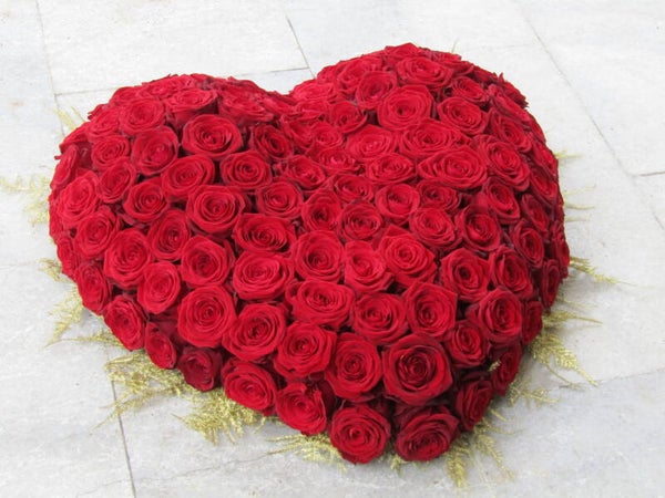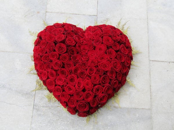Dit rouwstuk is volledig opgemaakt met prachtige rode rozen. De diepe kleur van de rozen symboliseert liefde. Een liefdevolle laatste bloemengroet. Omdat het hart bol is gestoken is het net een kussentje van rozen. Een hart heel altijd een magie die niet op een foto is vast te leggen.