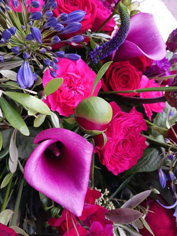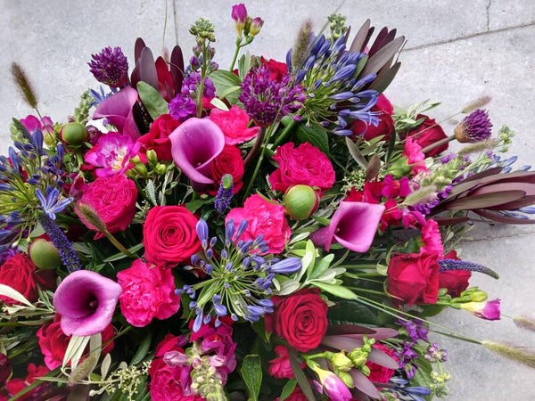 Een stijlvolle kistbedekking in een rijke mix van diepe kleuren. Dit ovale rouwstuk is gevuld met bloemen in warm paars, rood en fuchsia roze, wat samen een krachtig geheel vormt. De kleurencombinatie straalt liefde, warmte en kracht uit.