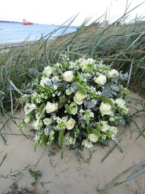 Dit klassieke Biedermeier rouwstuk is gemaakt met witte bloemen. De ronde, symmetrische vorm zorgt voor een elegante en tijdloze uitstraling. De witte bloemen stralen rust uit, waardoor dit stuk een serene laatste groet is.