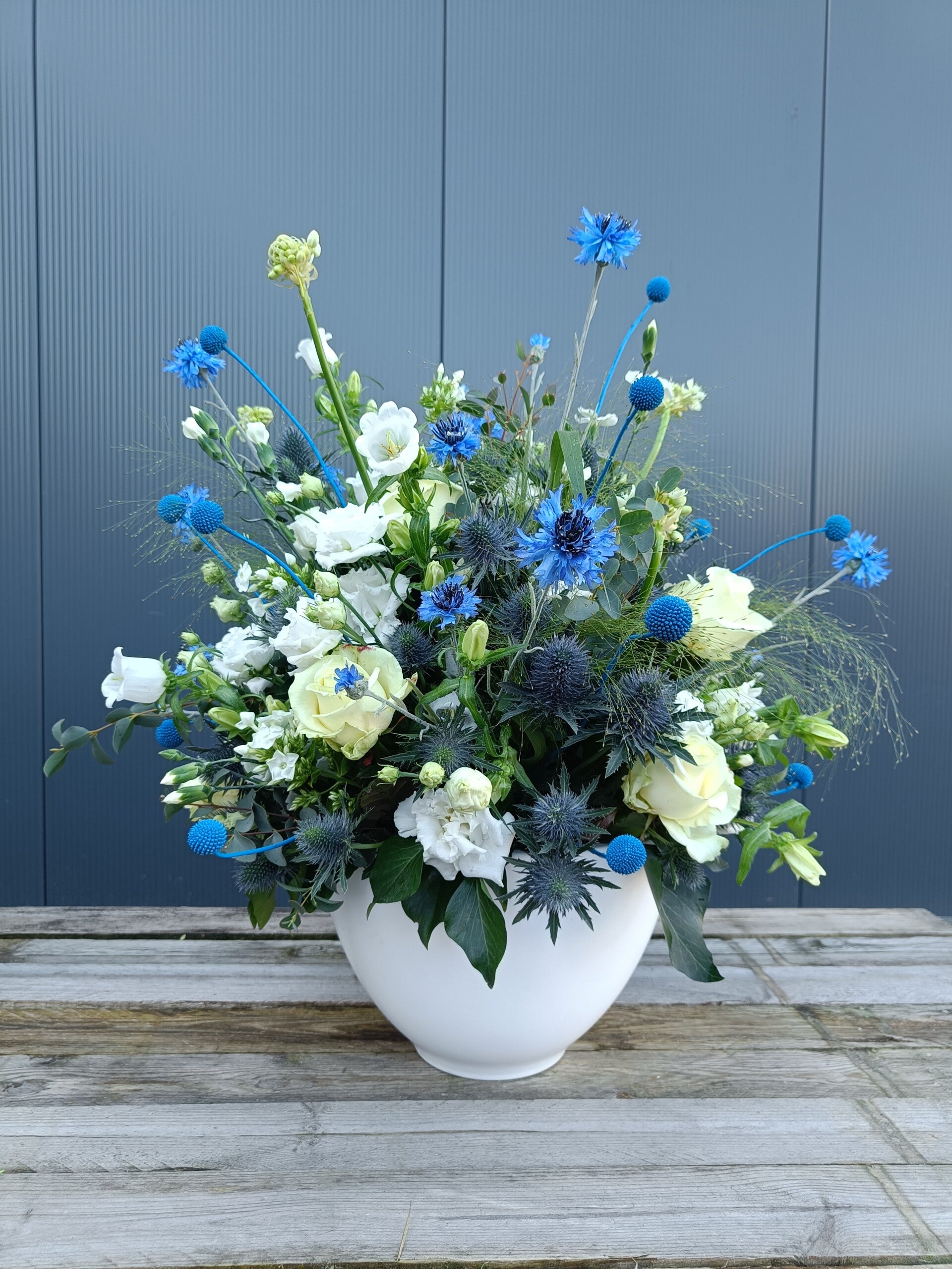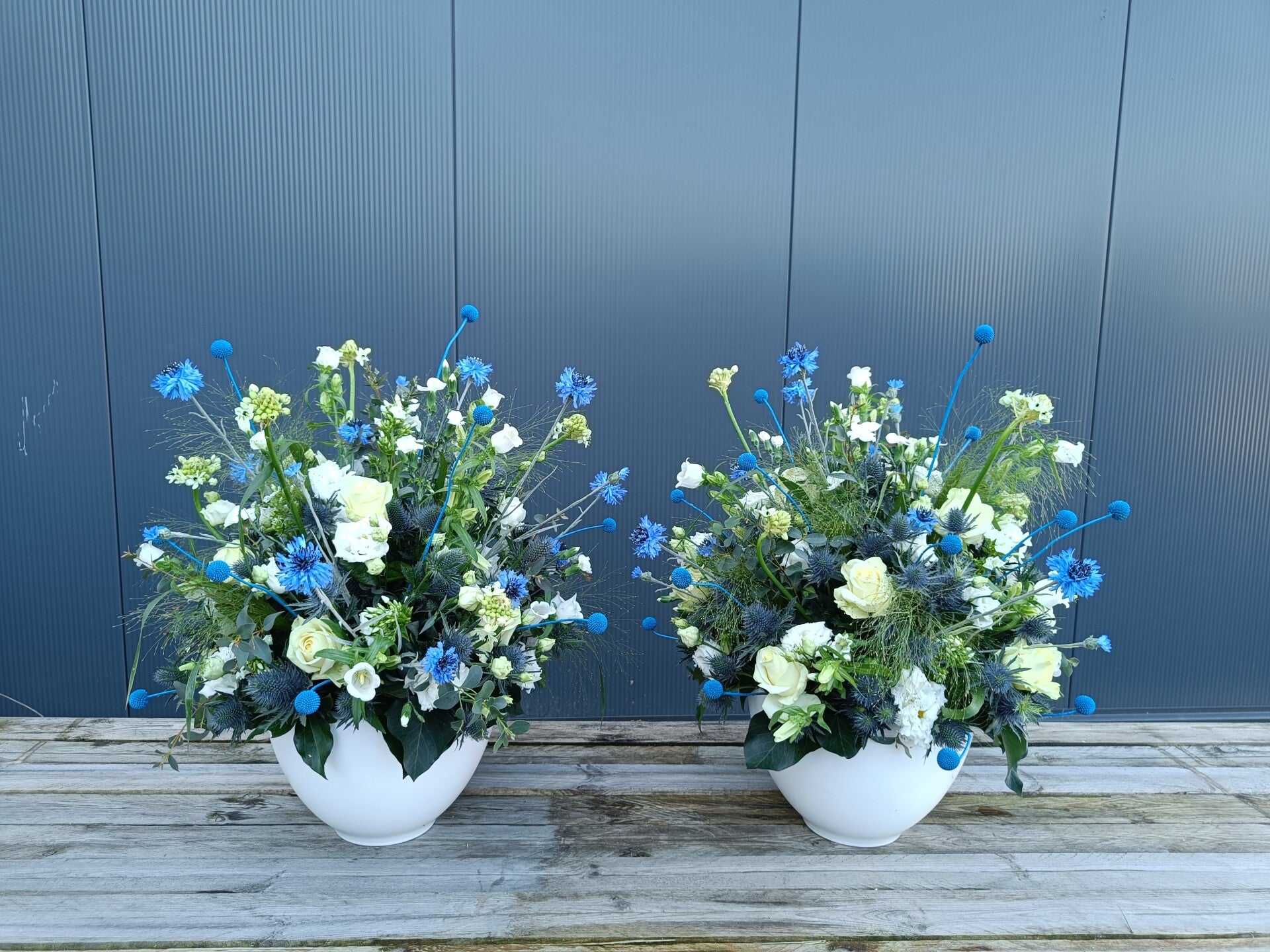 Witte bloempotten gevuld met bloemen. De kleur is aan te passen naar wens. Deze potten worden vaak aan beide kanten van de entree gebruikt.
