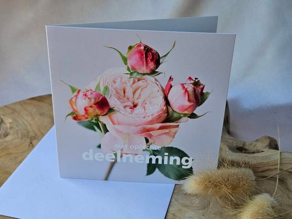 De kaart wordt met de hand geschreven en vaak dezelfde dag nog verzonden. Natuurlijk ook mooi om bij een troostboeket te geven.