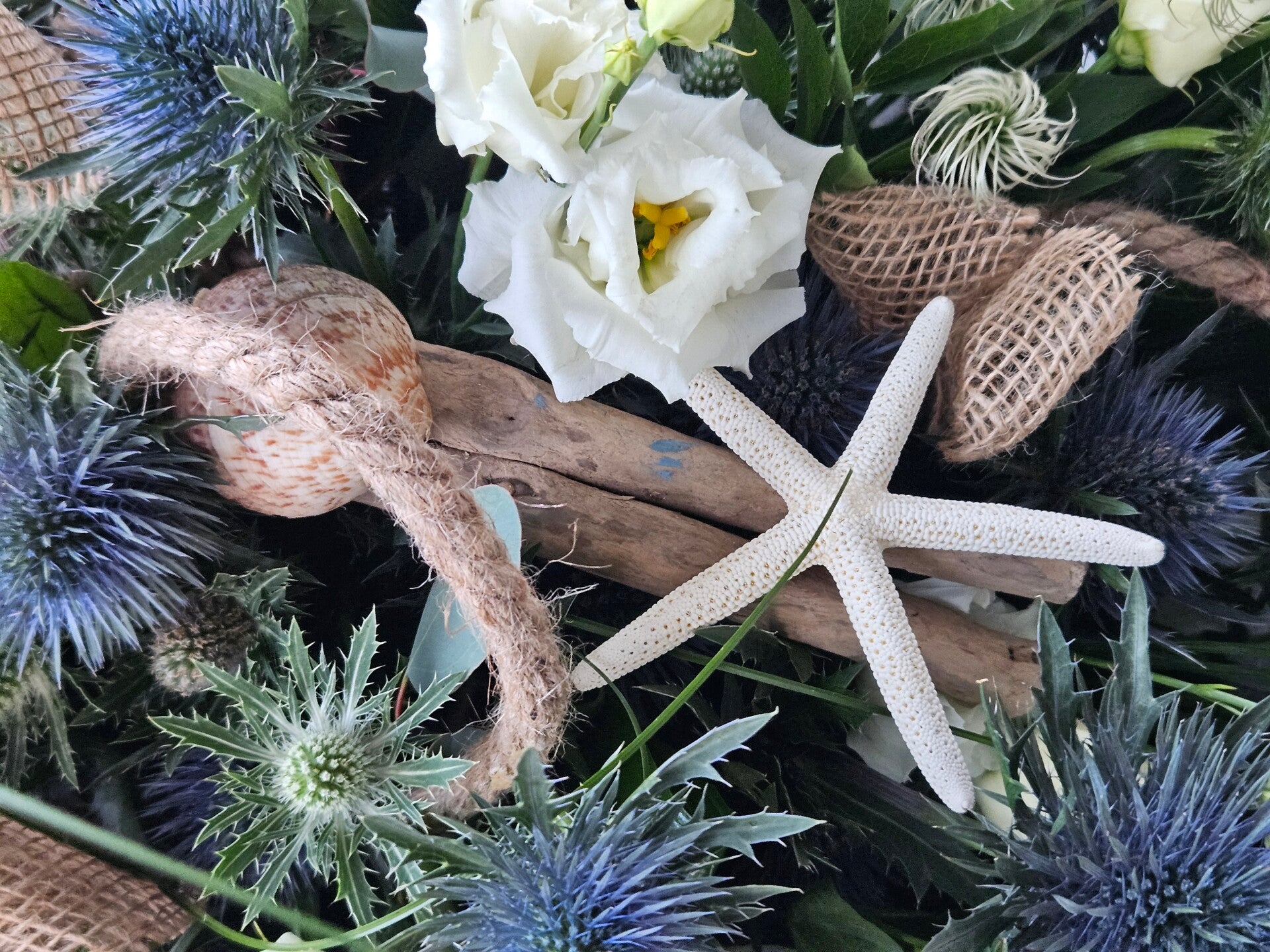 Een rijk gevuld rouwstuk in ovale vorm, samengesteld met blauwe distels, kustachtige grassen. Het geheel ademt een sereen zeegevoel, met natuurlijke stukken hout, schelpen en zeesterren die het geheel een unieke kustuitstraling geven.