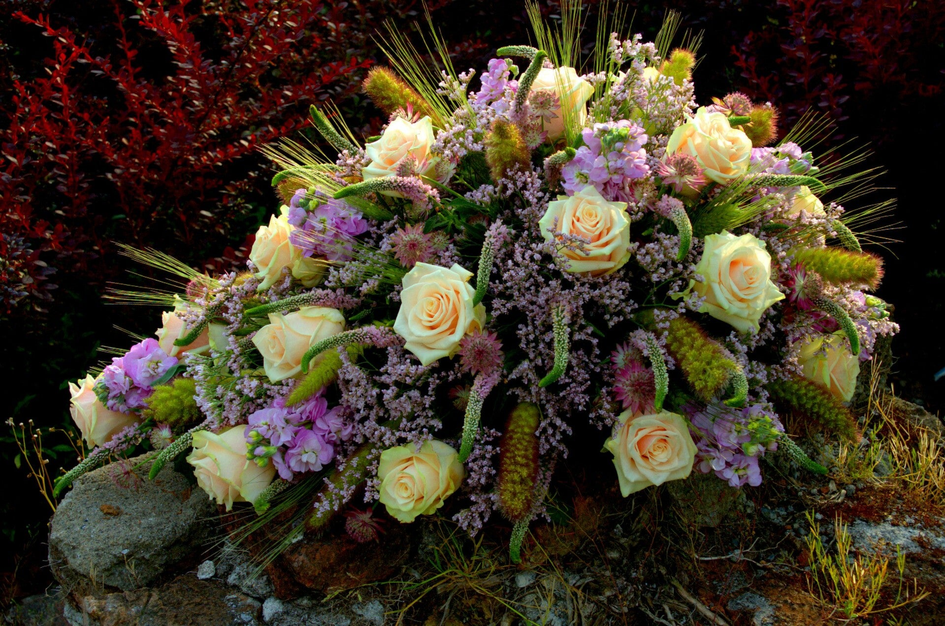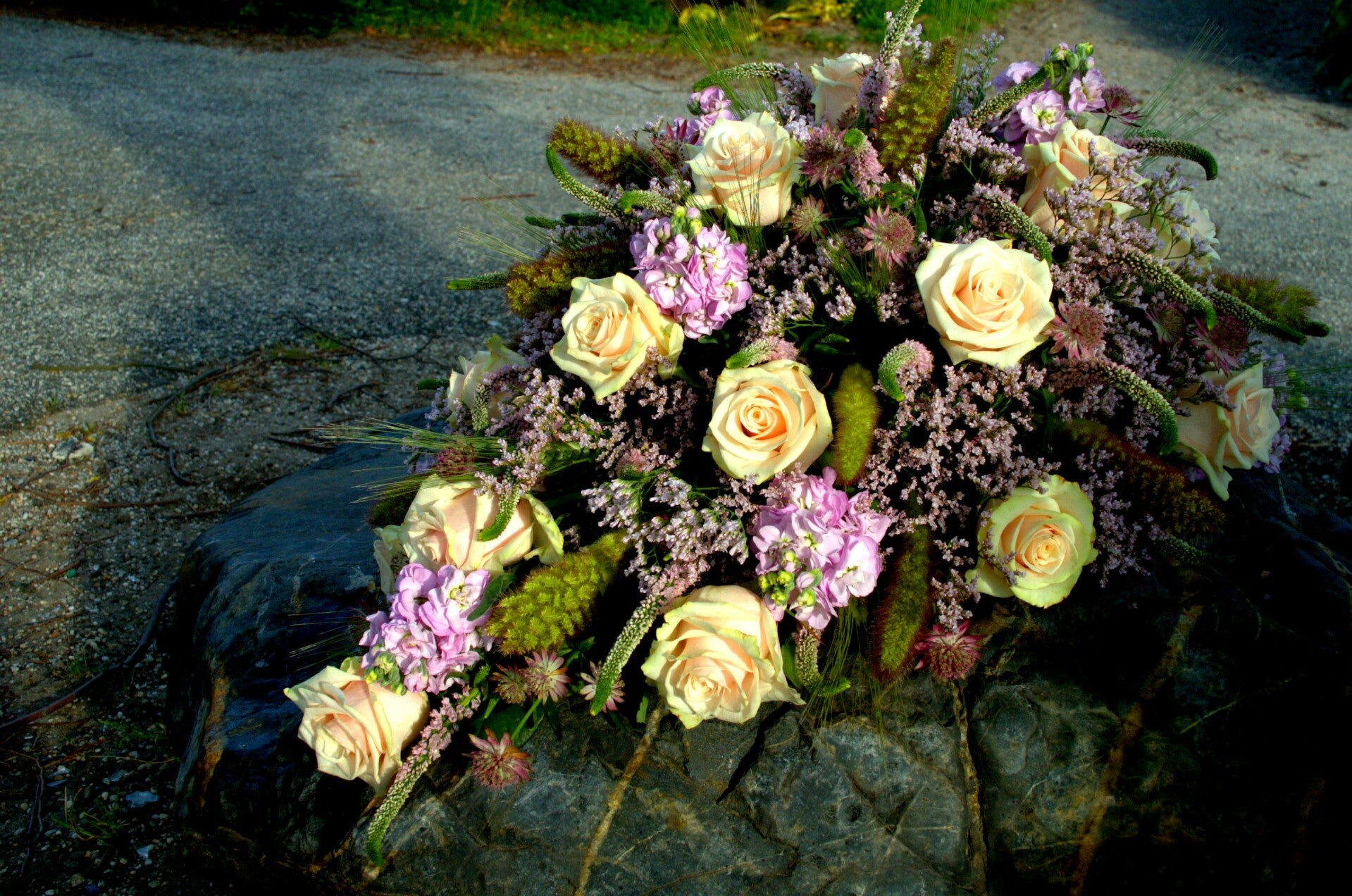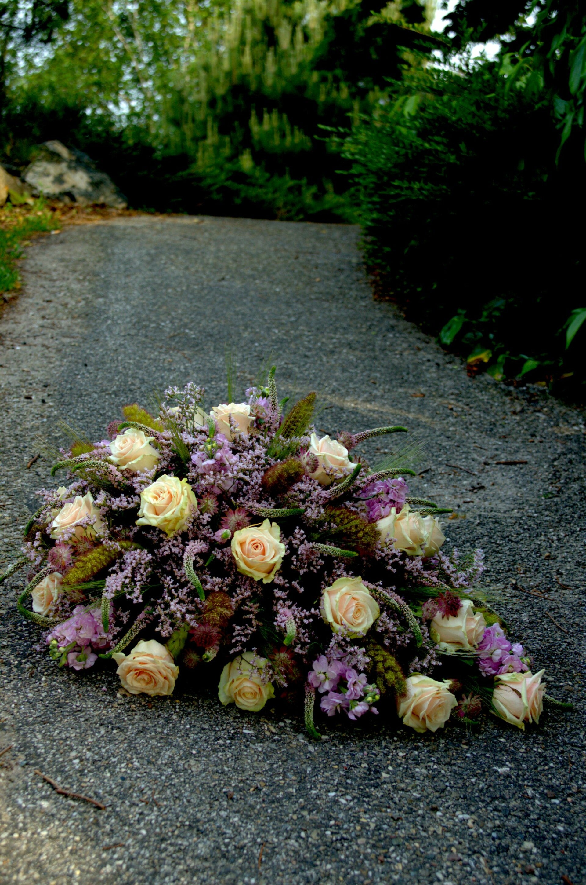 Een zacht en sereen rouwstuk in druppelvorm, gestoken in lieflijke pastelkleuren. De bloemen zijn luchtig geschikt, afgewisseld met speelse grasjes die het stuk een natuurlijk en verfijnd karakter geven.