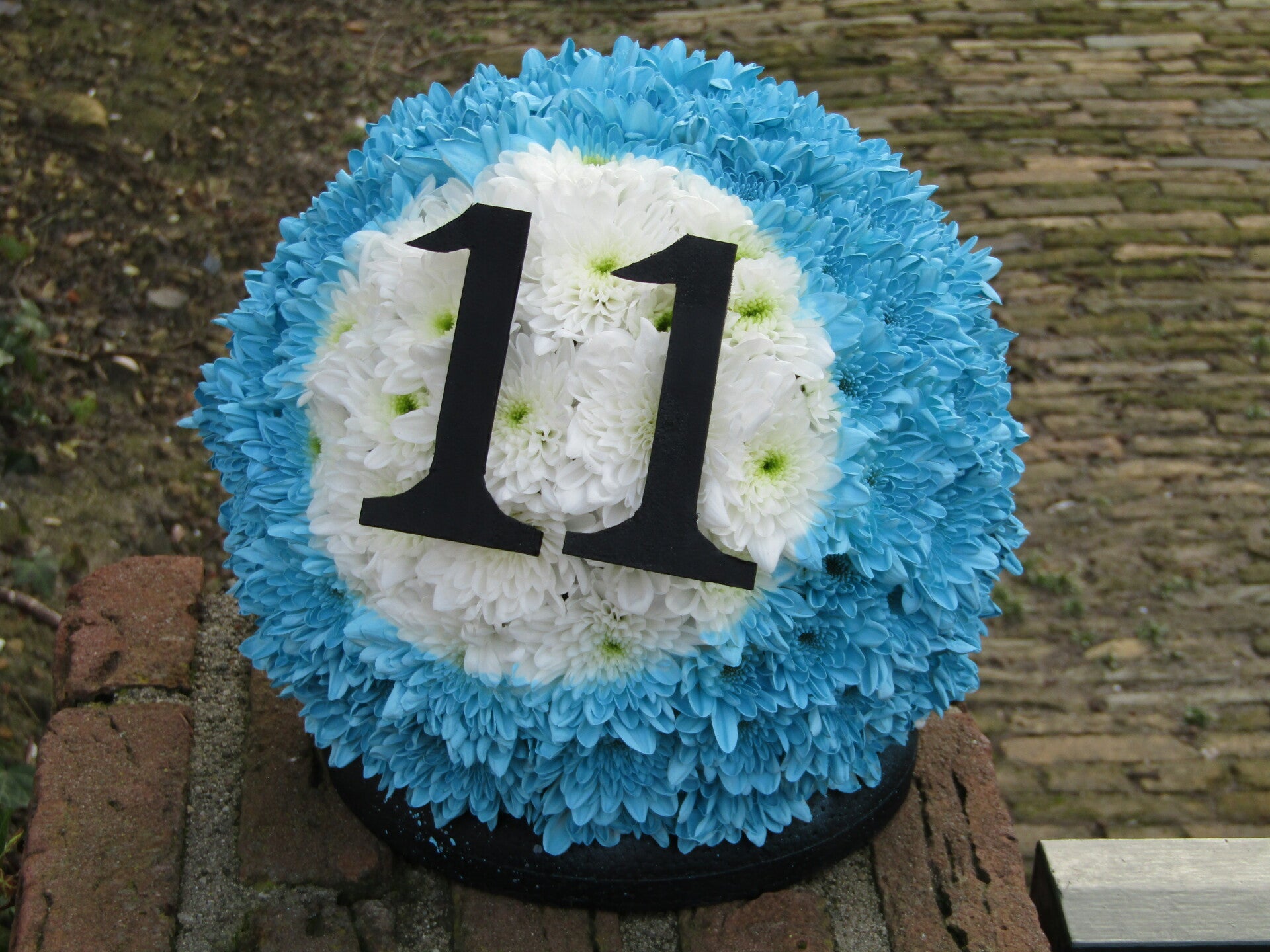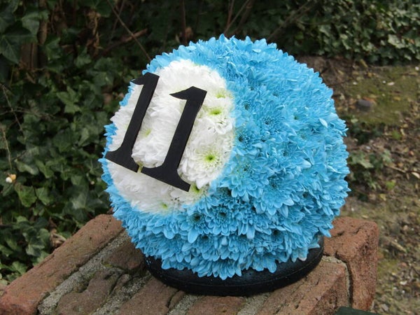 Een bijzonder bloemstuk in de vorm van een biljartbal, perfect voor de liefhebber van het spel. Deze creatie is volledig met bloemen gestoken en kan in iedere gewenste kleur worden gemaakt, bijvoorbeeld blauw met wit, of aangepast naar een favoriete bal uit het biljartspel.