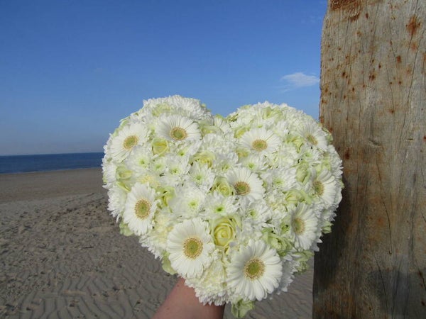 Dit hart is opgemaakt met verschillende witte bloemen en heeft een subtiel 3D-effect. De zachte, volle en fluffy vorm geeft het stuk een serene en elegante uitstraling. Een tijdloos en liefdevol rouwstuk.