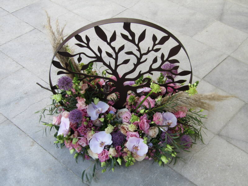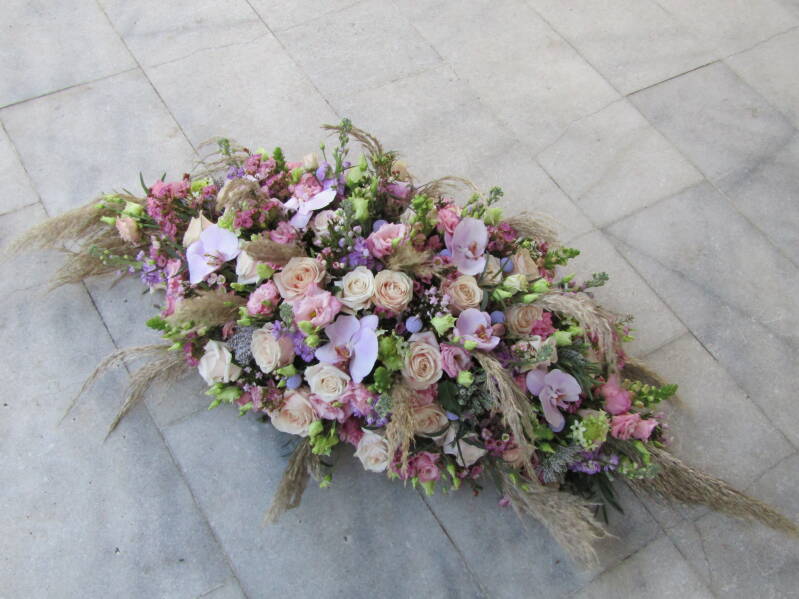 De strooibloemen zijn prachtig gedecoreerd (de roosjes zijn losse blaadjes) en kleuren bij de kistbedekking. Het geheel vormt een harmonieus geheel.