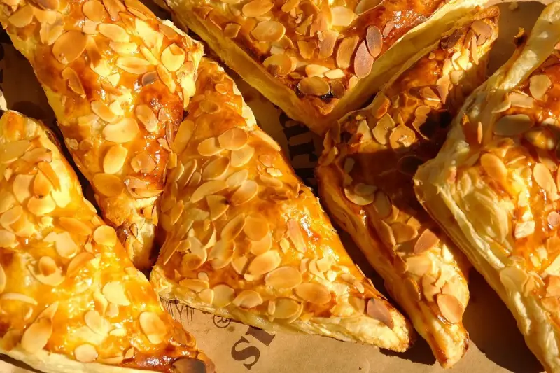 - Leg een driehoekje bladerdeeg neer met de plakkerige kant boven.